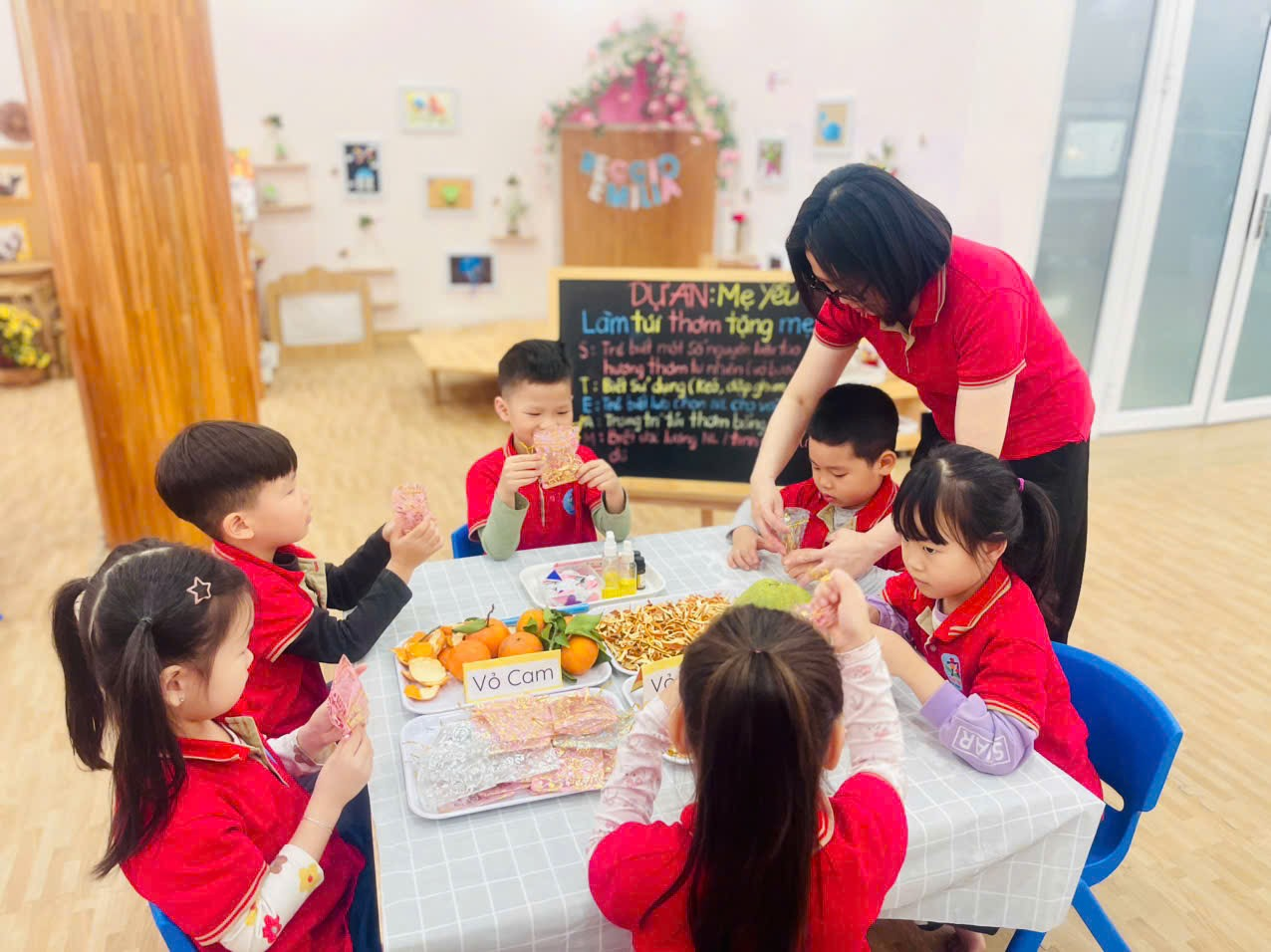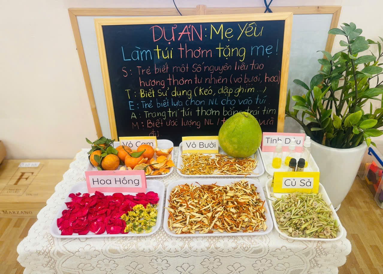 những cống hiến và sự hy sinh , yêu thương của những người phụ nữ với gia và xã hội. Với những đồ dùng và các nguyên liệu tự nhiên như : vỏ cam, vỏ bưởi, hoa hồng, hoa cúc, củ sả, tinh dầu tự nhiên ,kéo, hồ dán…Các con muốn làm túi thơm như thế nào để tặng cho các bà, các mẹ nhân ngày 8/3.