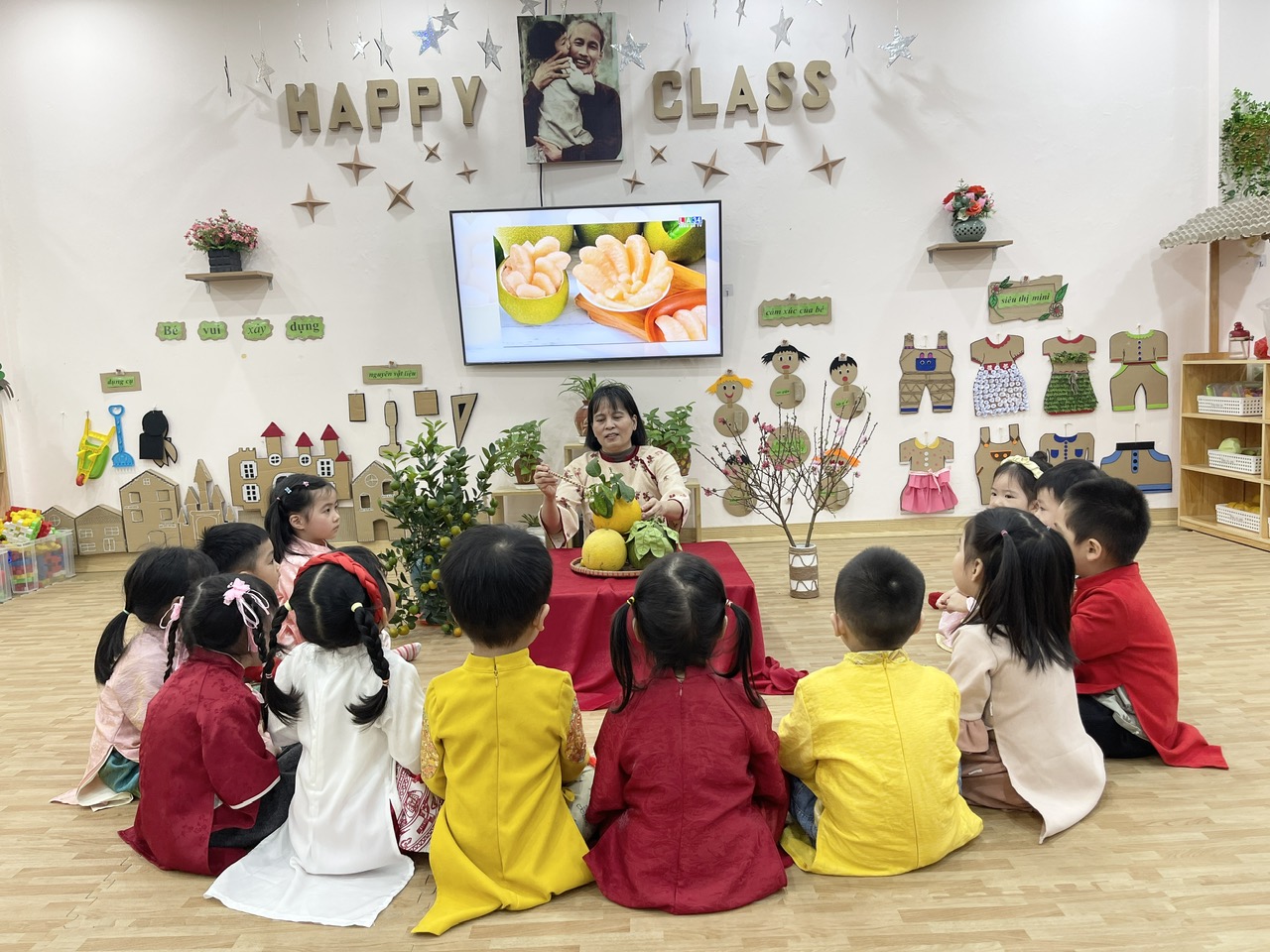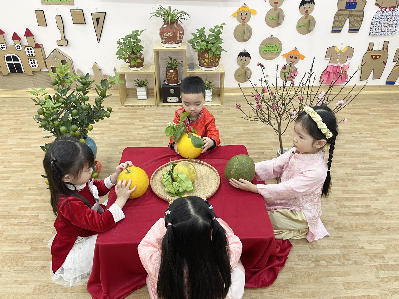 Các bạn nhỏ lớp C2 Trường MN Tuổi Thơ đã tỏ ra vô cùng thích thú khi được giới thiệu về quả bưởi to, tròn, có màu xanh, màu vàng bắt mắt.